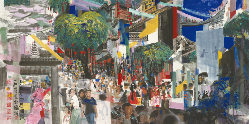 在他笔下的《三坊七巷》,南后街上人流如织,马鞍墙下皮影戏正在上演,观众围得水泄不通,著名的“爱心树”在画面上方伸展枝丫。殷双喜曾评价:“石齐构图的一个特点是‘唯恐天下不乱’。人物不像通常那样主体明确,而是在层层重叠的色墨之中,随着心境的变化和构图需要,时隐时现。”这种构图方式在《三坊七巷》中表现得淋漓尽致,画面中密集的人群与古老的建筑相互映衬,既保持了历史的厚重感,又充满了现代生活的活力。