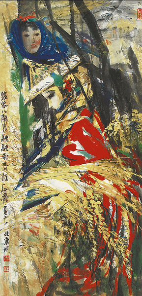 创作于1999年的《悠悠八闽水》更进一步,将海的意象与田园风光巧妙融合。画面中,戴蓝色花头巾的惠安女与戴斗笠、捧稻穗的农妇并肩而立,身后是连绵的稻田与远方的海平线。石齐在写意水墨和工笔重彩之外,独立地探索出一种写意性极强的动感色彩语言。这种色彩语言在《悠悠八闽水》中得到了完美展现,画面既保持了传统中国画的意境,又融入了现代艺术的色彩表现力。