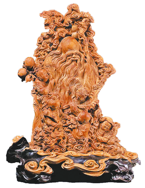 作品《福禄寿》采用历经七八百年岁月沉淀的龙眼古木为基,黄清銮凭借着精湛的技艺,赋予福禄寿三位神仙栩栩如生的形象。人物的面部表情刻画入微,笑容中透露出祥和与喜悦;服饰的纹理流畅自然,仿佛随风飘动;手中所持的器物也雕刻得精致细腻,每一个细节都展现出他对艺术的极致追求。