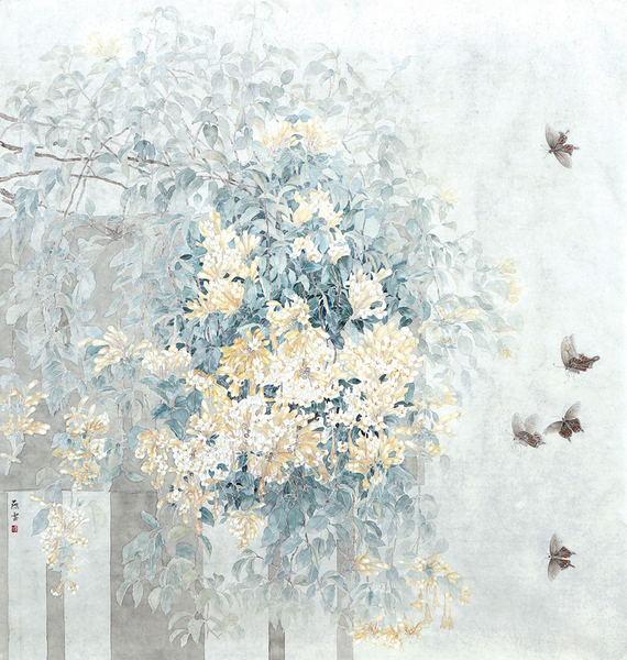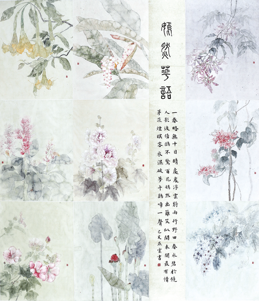 如今,我依然在法院工作,也依然在绘画的道路上不断探索。这两条道路,早已不再是彼此的羁绊,而是相互滋养、相互成就。法律的严谨,让我的绘画多了一份理性的秩序感;而绘画的自由,则让我的工作多了一份人文的温度。在《嫣然花语》《春意闹》《汀渚秋声》等作品中,我尝试用更丰富的色彩和更自由的构图,去表达对自然和生命的热爱。《嫣然花语》以九幅小品组成,每一幅都描绘了不同的花卉,配以题诗,如同一首首流动的视觉诗篇;《春意闹》则以满幅的繁花和飞舞的蝴蝶,展现了春天的勃勃生机;而《汀渚秋声》则以残荷与水鸟,描绘了秋日的萧瑟与宁静。这些作品,是我对自然的礼赞,也是自己对生命的感悟。