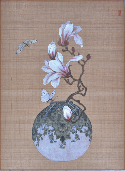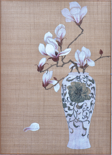 真正系统地学习没骨工笔花鸟,是在工作多年之后。没骨画,顾名思义,是不用墨线勾勒轮廓,直接以色彩晕染成形的画法。它对画家的功力要求极高,既需要扎实的造型能力,又需要对色彩和水的精准把控。初学时,我也曾感到迷茫和挫败。那些看似随意的晕染,实则蕴含着千锤百炼的法度;那些灵动的花鸟,背后是对自然万物细致入微的观察。初期我大量临摹古人的作品,从恽寿平的清逸淡雅,到任伯年的灵动洒脱,每一笔都反复揣摩。同时,我也更加用心地观察自然。春日的玉兰、夏日的芙蓉、秋日的残荷、冬日的寒梅,都成了我笔下的常客。我发现,法律与绘画,在本质上有着惊人的相似之处。法律是社会运行的法度,而绘画,则是笔墨色彩的法度。在法律的世界里,我追求的是程序正义与实体正义的统一;在绘画的世界里,我追求的则是形与神、法与意的和谐。在作品《青玉案》系列中,我将玉兰与青花瓷组合,精心设计构图与布局,让画面既有对称的稳定感,又不失灵动的变化,瓷瓶纹饰与玉兰形态相互呼应,形成和谐的视觉节奏,这份对秩序与和谐的追求,正是法律职业赋予我的思维方式。而艺术创作带来的平和与从容,也让我在工作中更有耐心与定力,面对复杂的案件,总能以平和的心态抽丝剥茧,在法理与情理之间寻得平衡。